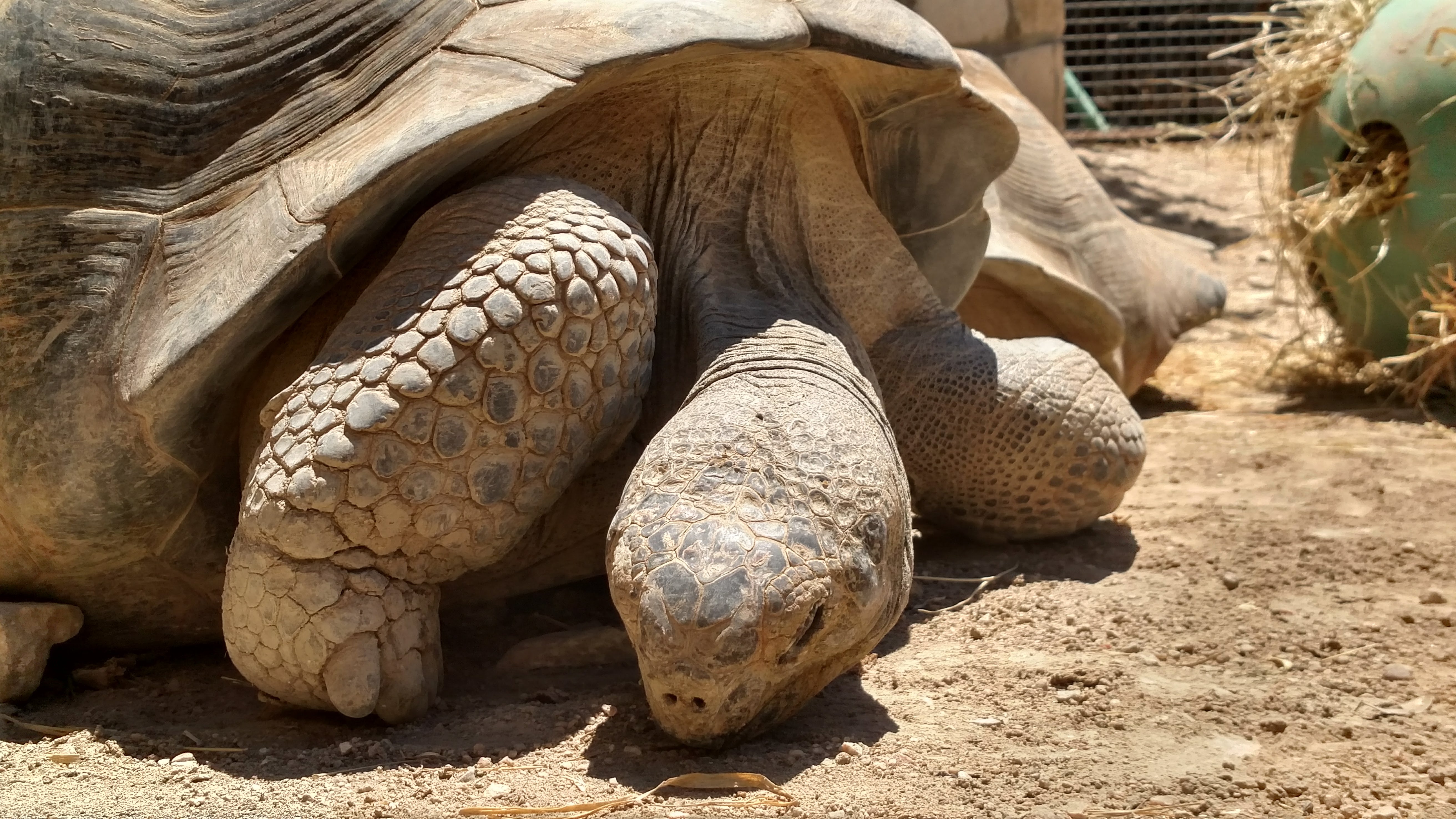 Two tortoises were eating when we arrived, munching on a snack of lettuce and some melon. The third was basking nearby in the afternoon sun. To my surprise, they seemed eager to interact with us. One of the tortoises took a break from his veggies to come over and say hello.