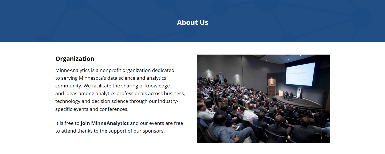 MinneAnalytics is a nonprofit organization with a simple message: the Minnesota analytics community is strongest when people come together to share knowledge. I used WordPress to create a website that is easy to navigate and welcoming, inviting the visitor to learn about the organization and become a part of the community.